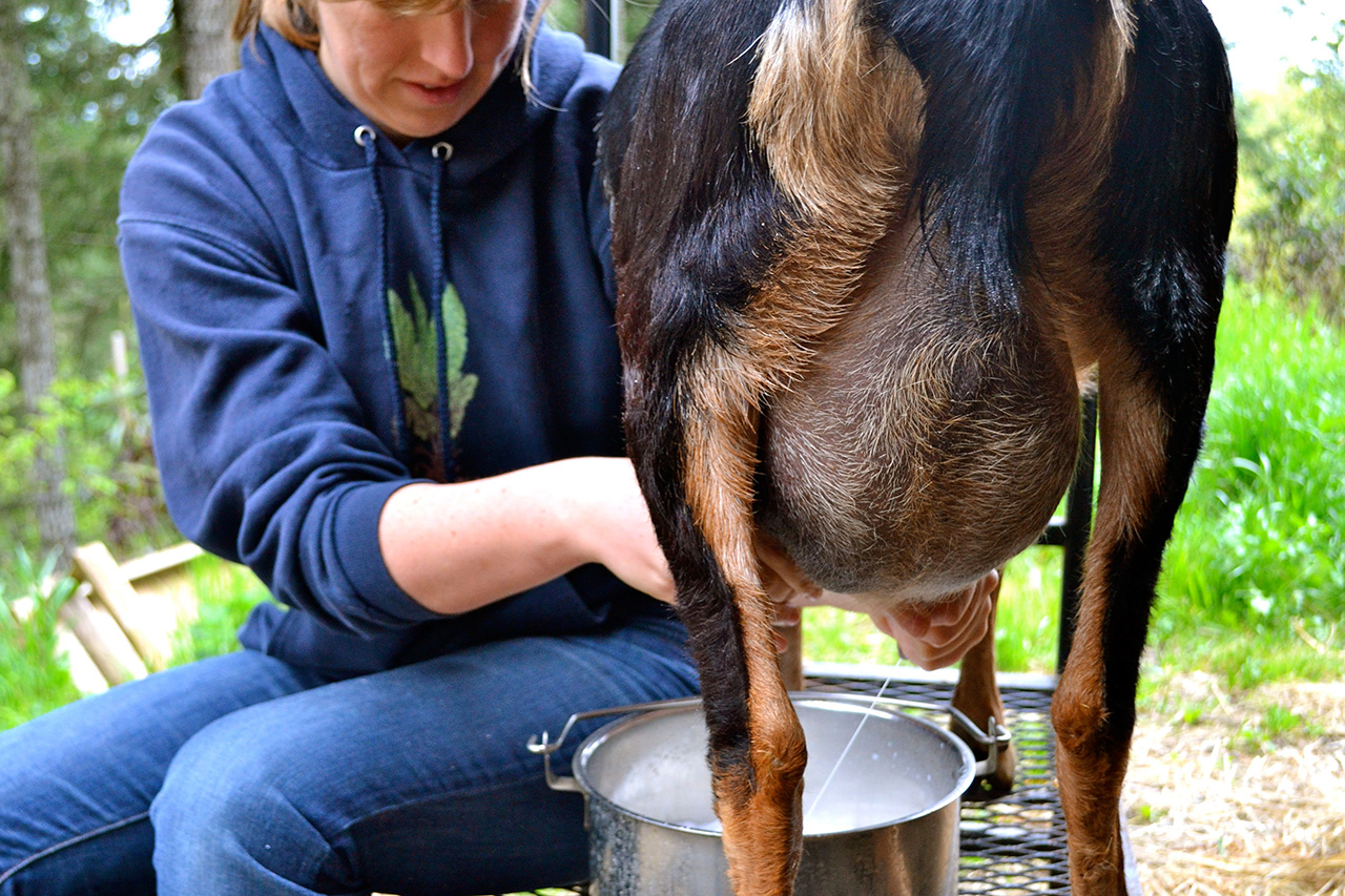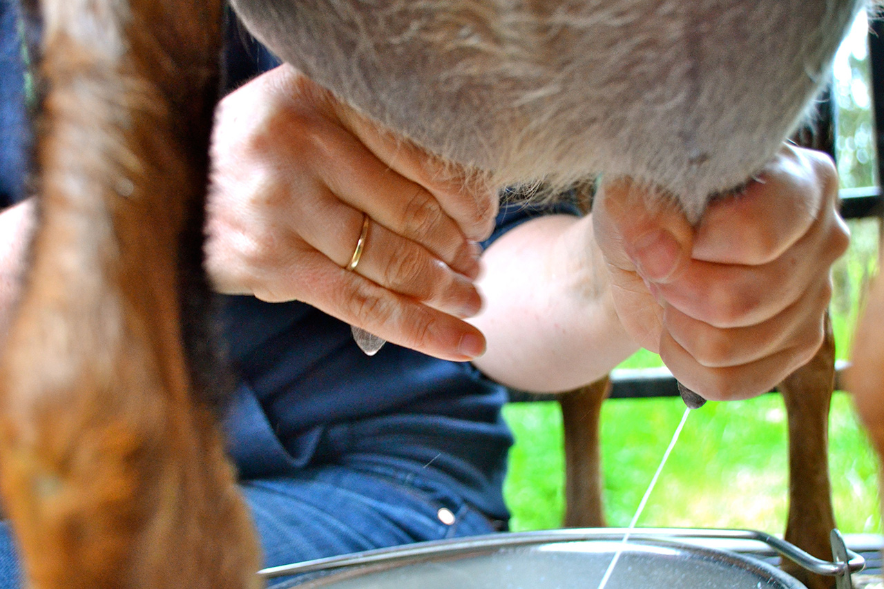 Большим и указательным пальцами сдавливают сосок у основания, первые несколько струек советуют сдоить в отдельную емкость. Затем можно полноценно доить козу.