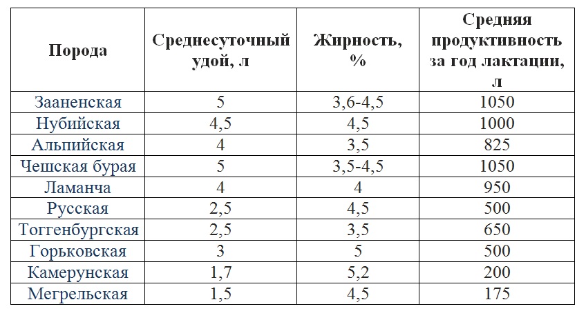 Весной удой составляет 55 литров, летом до 75-80 л молока, с меньшей жирностью, но большим количеством. За год от козы получают в среднем 400 л молока. Но это лишь обобщенная информация. Если выращиваются высокоудойные молочные породы( Зааненская), то они могут давать свыше 1 тонны молока в год, при хорошем рационе. Есть породы которые приносят молока в районе 900-1000 литров. Чтобы определиться и понять какая порода коз сколько дает молока и сколько дней необходимо посмотреть на таблицу.