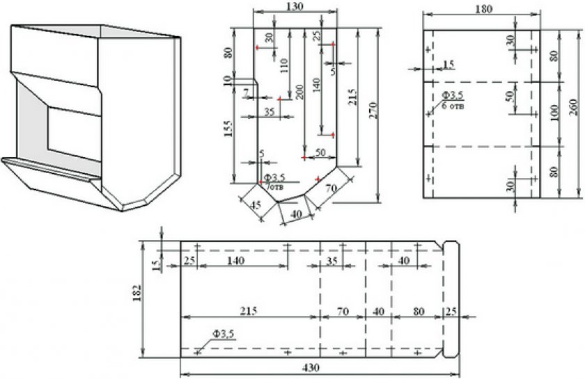 - Из листа жести или оцинковки вырезают кусок. По ширине он чуть уже проема дверцы, в верхней части — наоборот, немного шире. Кусок сгибают тоже под углом 30°. Задняя его стенка — выше передней.