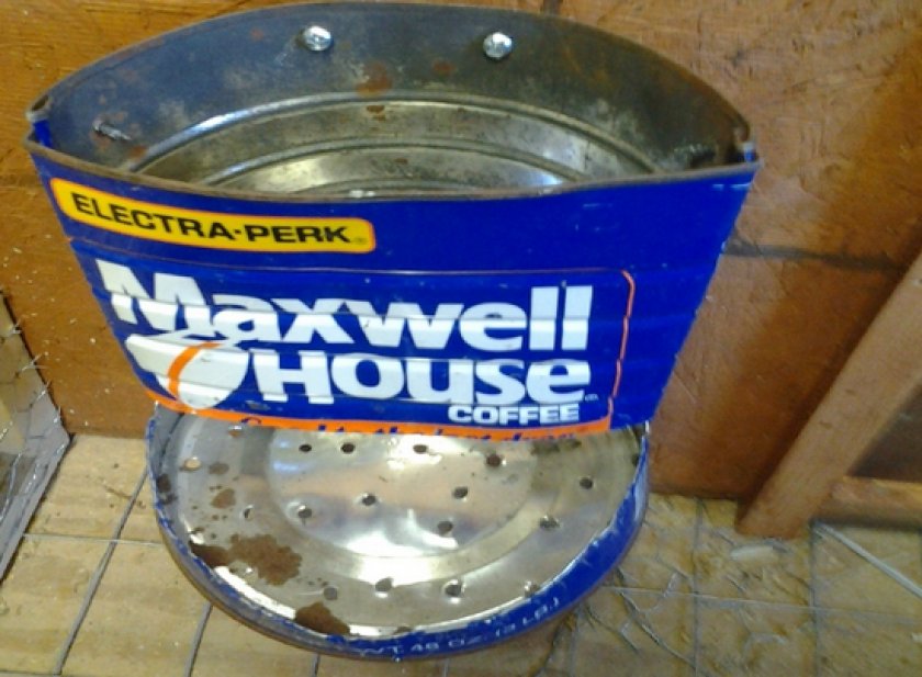Если эстетический вид клетки для хозяина кроликов не имеет особого значения, чтобы долго не возиться с изготовлением бункерной кормушки, можно использовать обычную жестяную банку. Выглядеть такие ясли будут примерно вот так: