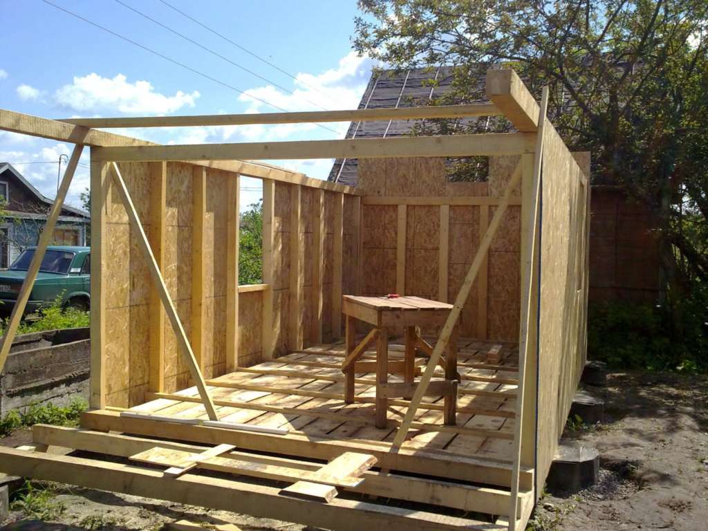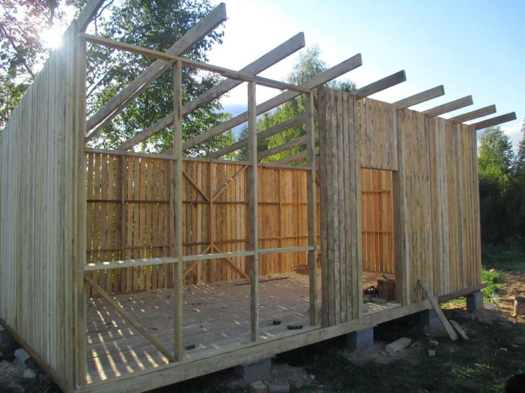 Шаг 1. Закладка фундамента. Для этого следует по периметру будущего строения нанести колышками разметку. Затем по веревке (леске) расчертить границы котлована под фундамент. Теперь нужно вынуть землю на глубину до 70 см при условии не сыпучих грунтов, установить опалубку, залить бетонный раствор, равномерно распределяя арматуру. Уровень готового основания должен быть выше поверхности почвы на 10-15 см. Когда он высохнет через несколько дней можно уложить гидроизоляцию и приступать к возведению стен.