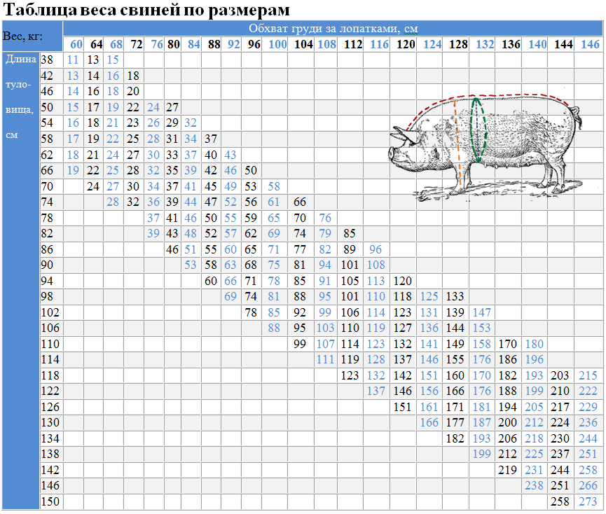 Чтобы достоверно вычислить вес взрослой свиньи, при замере лента не должна вклиниваться в шкуру животного или свободно свисать. Узнав размеры питомца, свиноводы высчитывают массу особи при помощи специальной таблички.