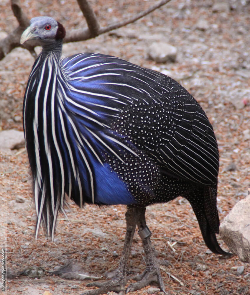 На этом участке почти нет оперения, поэтому он привлекает особое внимание голубоватым цветом кожи. Загнутый клюв среднего размера, под ним расположена мясистая бородка