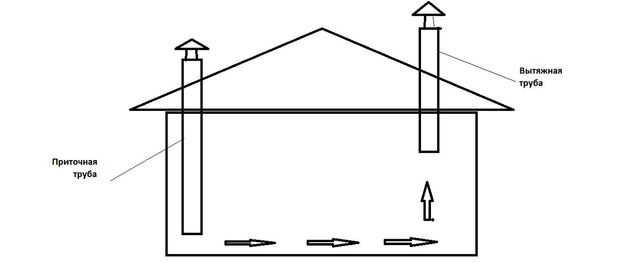 Наиболее проста и рациональна установка двух труб – вытяжной и приточной, диаметром не менее 200 мм. Вытяжная труба устанавливается под потолком и выступает на 1-1,5 метра над крышей. Приточная должна быть на 30 см над полом и на 30-40 над крышей. Такое расположение труб относительно друг друга позволяет осуществлять эффективную пассивную вентиляцию без потери тепла.
