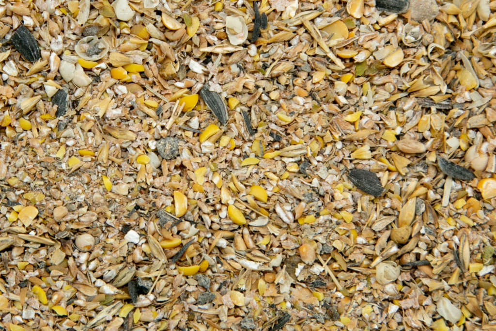- Примерно 60% питательной смеси состоит из измельченных зерен. Но нельзя, чтобы это была только одна культура. Идеальным вариантом будет смешивать одновременно несколько видов. В приоритете должна быть кукуруза, в том числе пшеница, подойдет ячмень в сочетании с овсом.