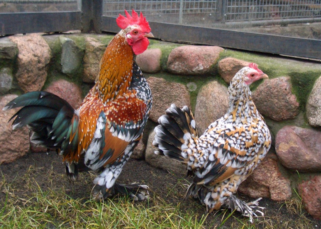 - немецкая, их еще называют карликовые. Вес курицы в среднем 800 гр, петуха — 1 кг.