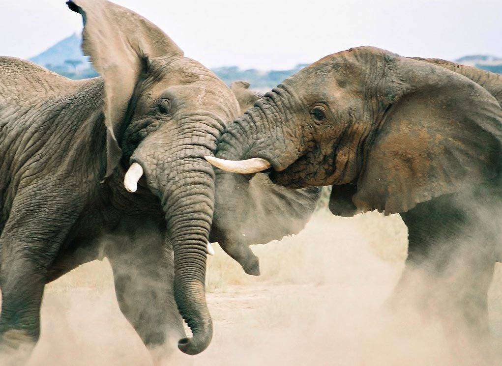 В обычное время самцы слонов достаточно дружелюбны друг к другу. Но в период спаривания они устраивают бои, и к самке допускается только победитель.
