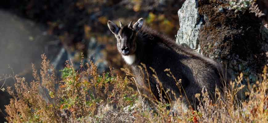 Амурский горал занесен в Красную книгу. Высота в холке достигает 80 см, а вес чуть не доходит до 50 кг. Имеет серо-бурую шерсть или серо-коричневую. Раскрашен он довольно кокетливо – на груди имеется белое пятно, губы тоже «подведены» белым цветом, у основания хвоста имеется белая окраска и даже имеются белые «носочки».