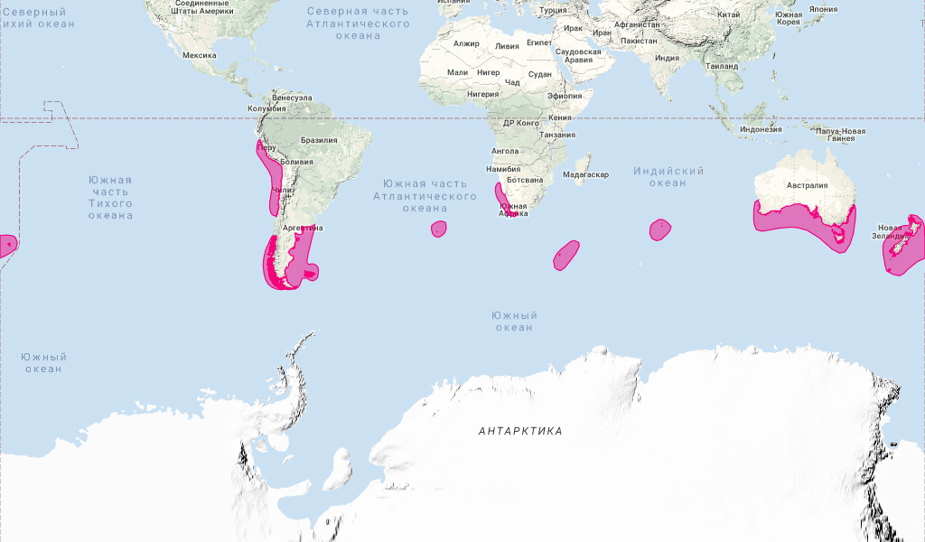 Вблизи Южной Америки, юго-западной Африки, южной Австралии, Тасмании, Новой Зеландии. У Южной Америки представителей вида можно встретить от юга Перу до мыса Горн, в районе Фолклендских островов. В Африке они обычны от Анголы и дальше на юг. В водах Новой Зеландии присутствуют везде. А возле Австралии обнаружены в холодных южных водах возле острова Кенгуру, Тасмании, в проливе Басс. Обычны возле островов в южной части Индийского океана.