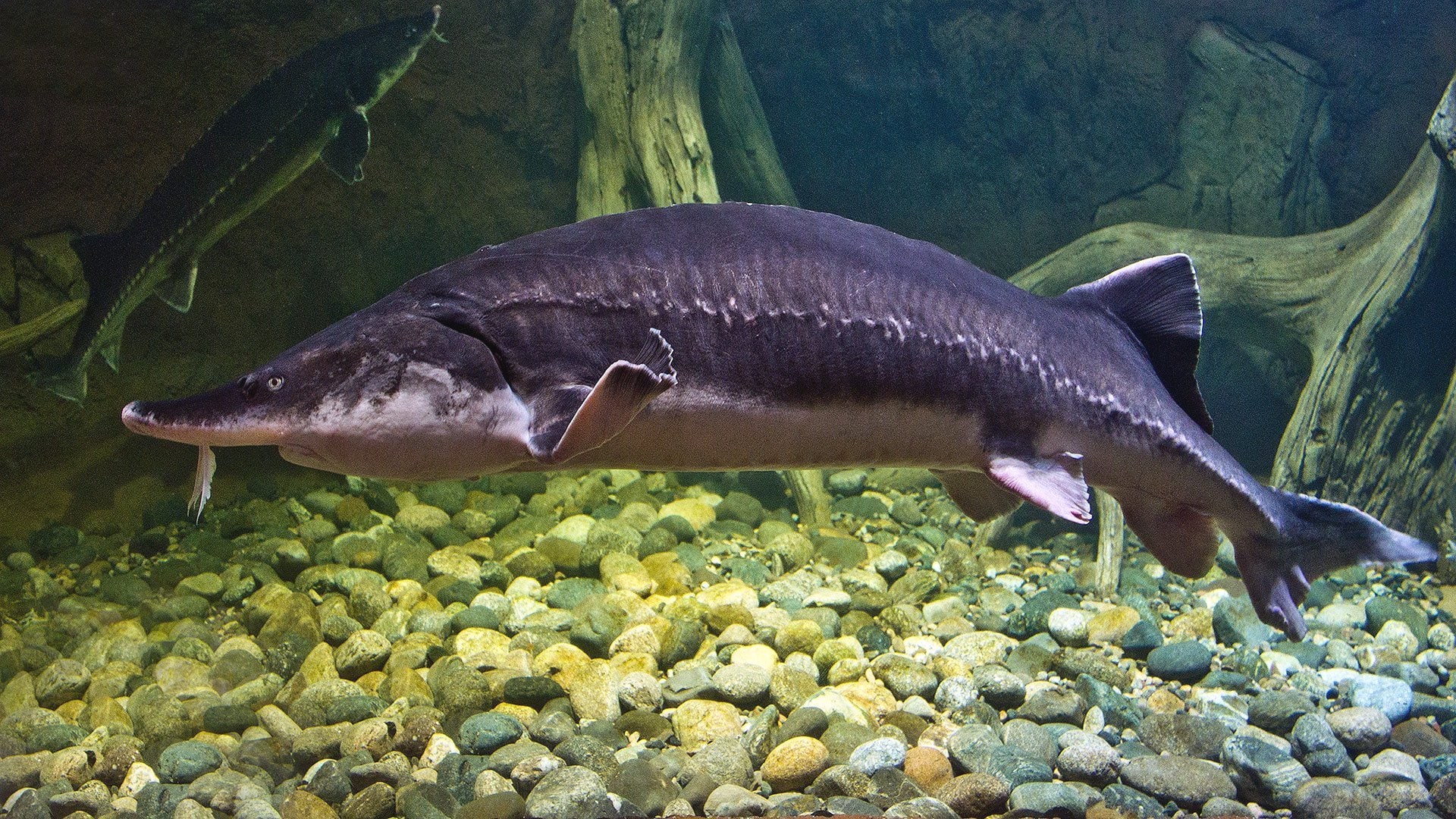Калуга – вырастает до шести метров при массе 500 кг. Вес рыбы 150 кг. У него сросшиеся межжаберные перепонки и заостренная морда с полукруглым ртом, окруженная листовидными боковыми усами. Тело покрыто костными гранулами. Встречается в бассейне реки Амур.