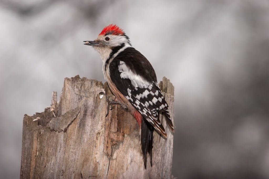 Маленький, с воробья, с яркой шапочкой на головке и с чёрно-белым оперением – так выглядит малый пёстрый дятел. Тельце компактно сложенное, хвостик короткий, острый на конце. Пальчики малый пёстрый дятел имеет другого вида, это его заметное отличие от большого и среднего: три пальца торчат вперёд, один сзади.