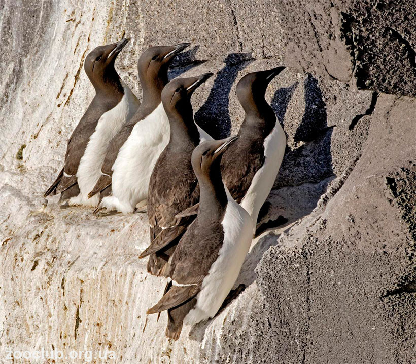 Самые распространенные обитательницы птичьих базаров Крайнего Севера — толстоклювые кайры — птицы средней величины (с массой от 0,75 до 1,5 кг), довольно скромной окраски: сверху — черные, снизу — белые; подбородок, горло и бока головы шоколадно-бурые.