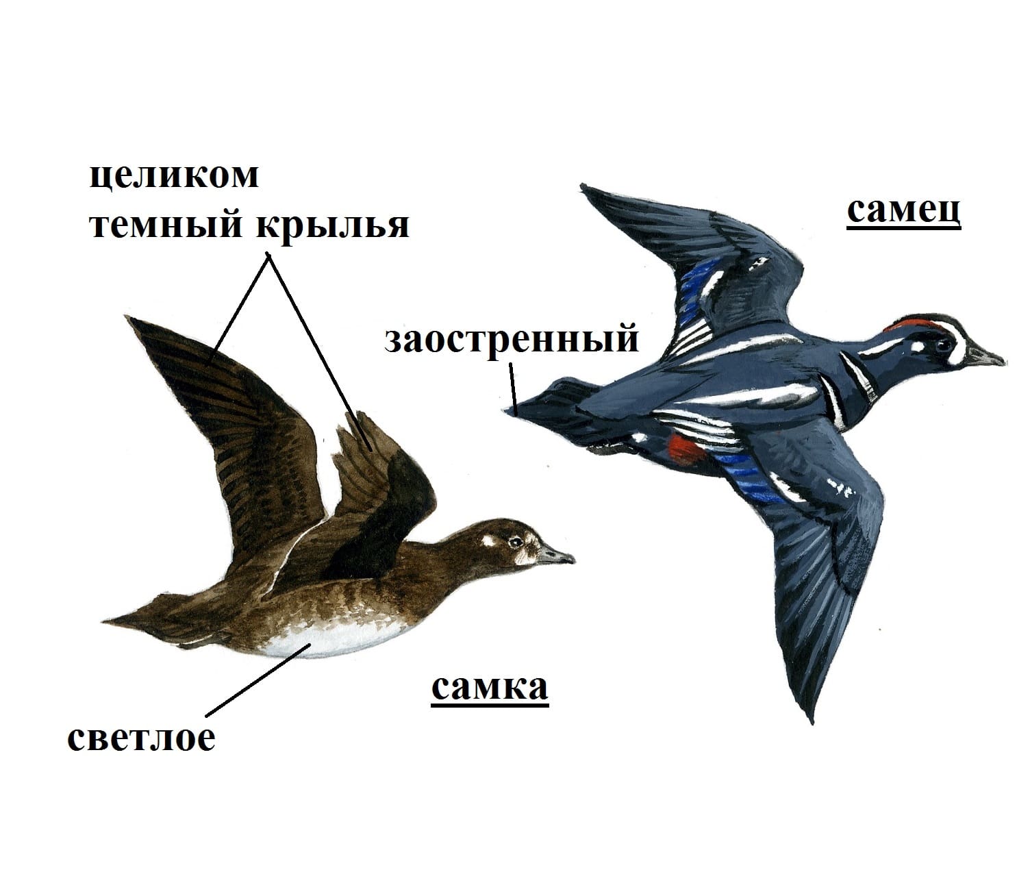 Самец в летнем пере, самка и молодые птицы напоминают темноокрашенную молодую морянку.