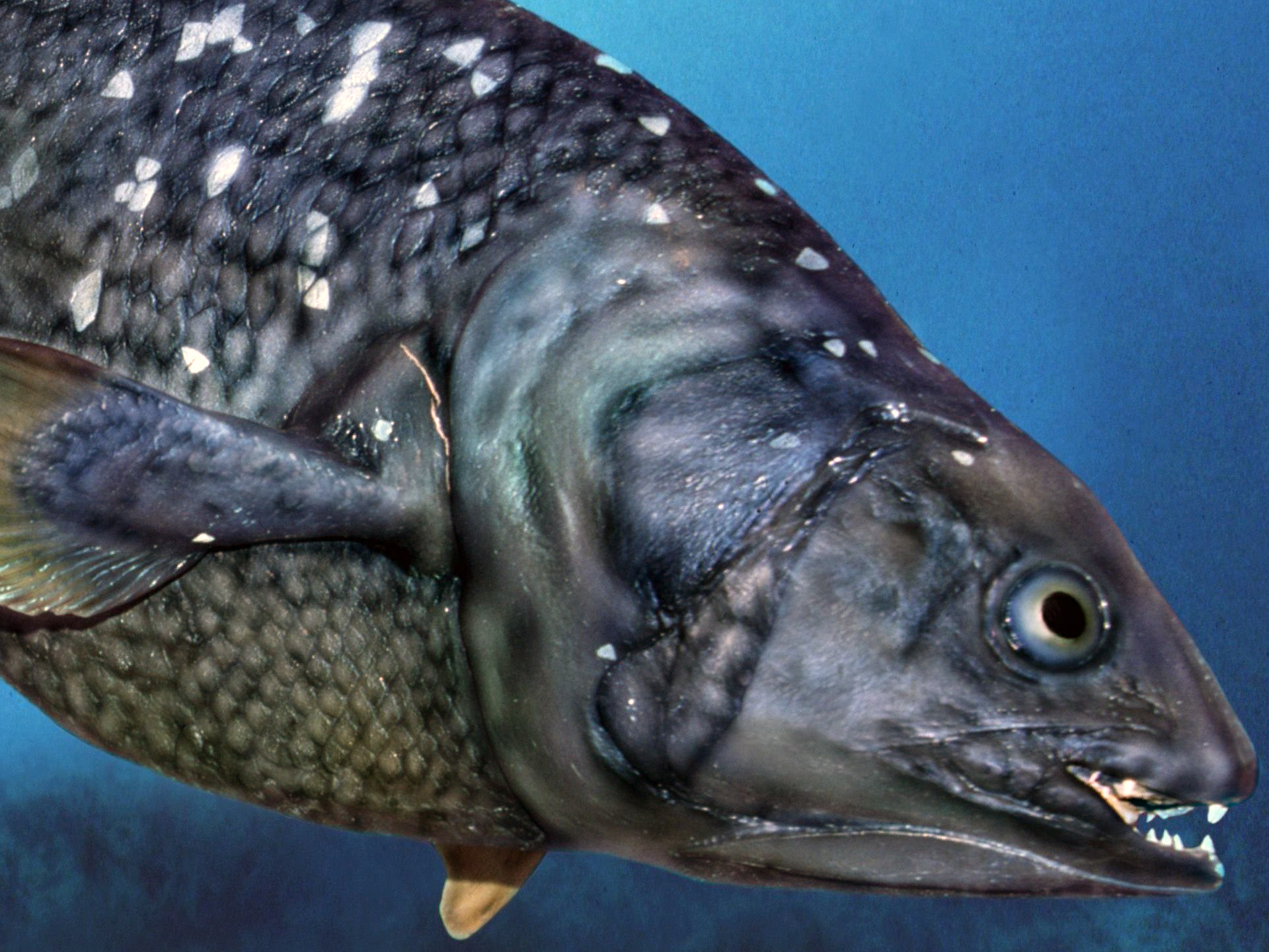 Огромная черепная коробка рыбы латимерии наполнена небольшим количеством мозга в виде жироподобного вещества, а чешуйчатое тело покрыто костными пластинами, имеющими круглую ромбическую форму.