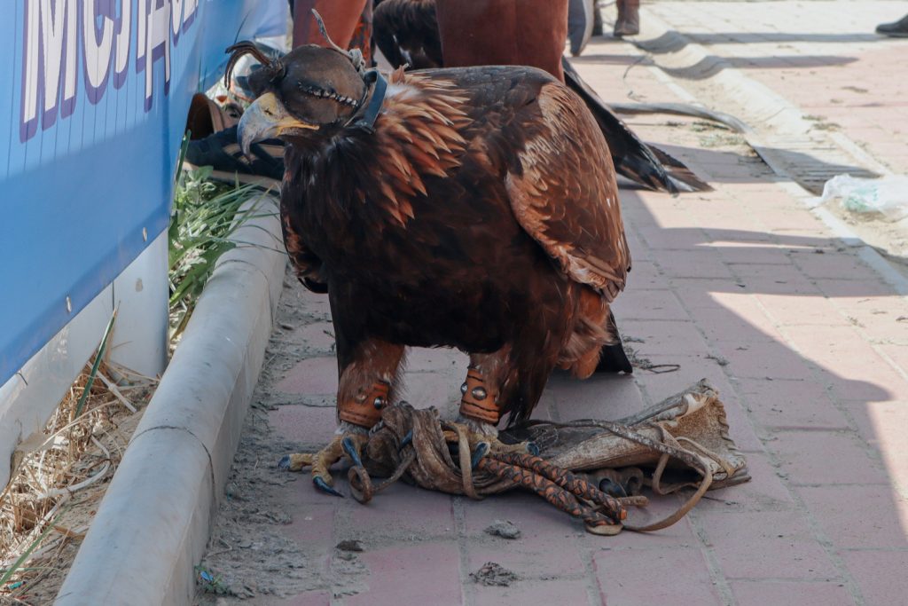 На голову птицы надевают томагу — маску без прорезей для глаз, чтобы избежать лишних визуальных раздражителей. Маску из мягкой дубленой кожи выкраивают по форме головы беркута.