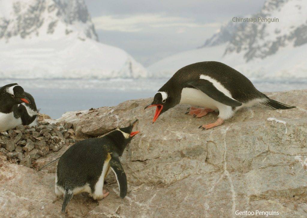 Этих птиц так же сложно перепутать с кем-то другим. Их отличительная черта ㅡ чёрная полоса на подбородке от одного уха до другого и чёрный клюв. Этих пингвинов ещё называют прекрасными альпинистами, потому что они поднимаются на обледеневшие склоны, используя клюв как кирку. Здесь птицы строят свои гнёзда, яростно защищая их от хищников.
