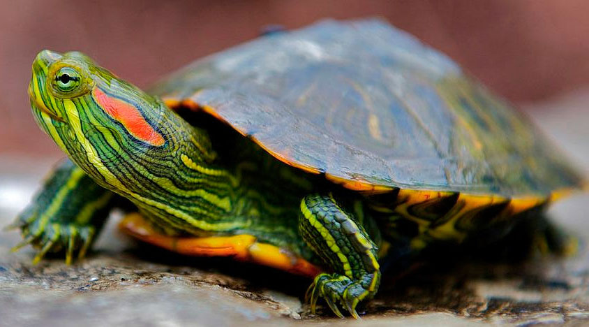 Все чаще красноухая черепаха становится популярным домашним питомцем. Свое название животное получило благодаря специфической особенности – красных пятнышек, которые расположены по бокам от глаз и видны до самой шеи.