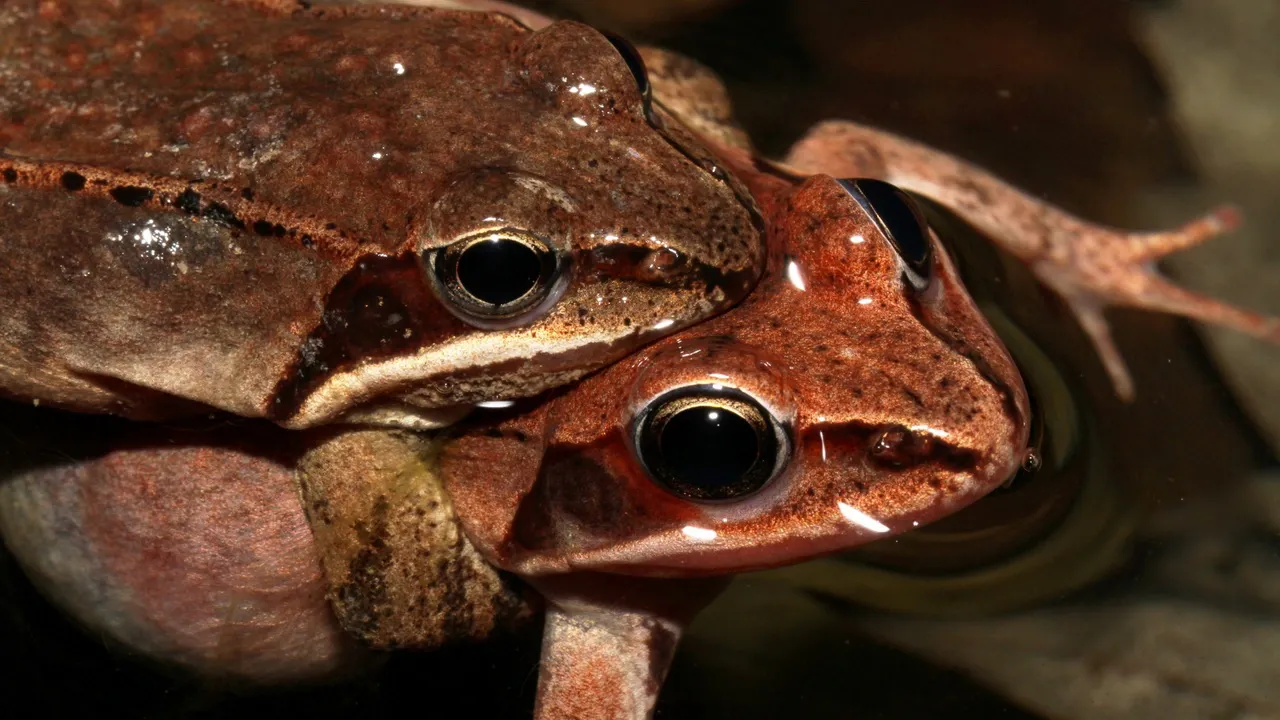Самец и самка лесной лягушки (Lithobates sylvaticus) спариваются в пруду. (Изображение предоставлено: Shutterstock)