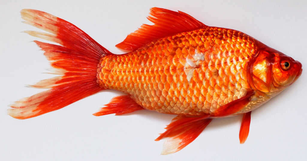 Золотая рыбка. Карась данного вида не встречается в дикой природе, поскольку выведен искусственно в декоративных целях. Узнать его можно по ярко-оранжевому цвету чешуи.