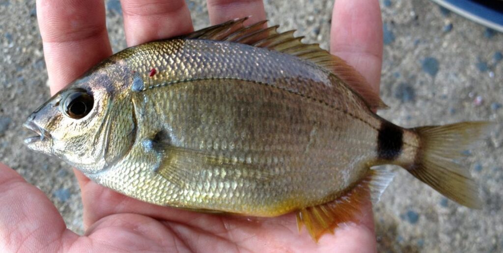 На фото представлена разновидность морской карася – белый спар. Форма плавников характерна для всех морских карасей, но полосы, свойственные ласкирю, обыкновенному и белому саргам, отсутствуют.