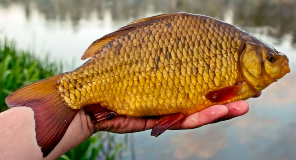 Они же карась обыкновенный, по ареалу распространения схож со своим серебряным собратом, но его численность в разы меньше. Свое название получил из-за характерного окраса чешуи. Отличительным признаком золотого карася являются плавники темно-коричневого оттенка.