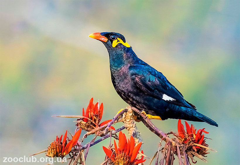 Хотя майна и похожа на обычного скворца, ее можно отличить по окраске головы, коричневой у молодых птенцов и постепенно темнеющей с возрастом. Черно-сизое тело имеет коричневый оттенок, а нижние покровные перья хвоста и брюшко окрашены в белый тон, что хорошо заметно, если наблюдать за птицей в полете, еще один отличительный признак майны – насыщенный желтый цвет в области глаз и небольшого клюва.