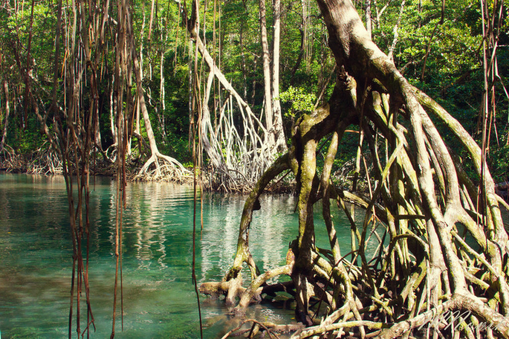 Вечнозелёные тропические мангры – поистине удивительное творение природы. Эти уникальные деревья, образующие целые рощи и леса, существуют на границе суши и моря. В периоды приливов такие лесные царства скрываются морскими водами, и лишь верхушки этих деревьев возвышаются над водой, из-за чего в такие моменты можно подумать, что это изумрудные острова. Но вот наступает отлив, вода отступает, и показываются причудливые, словно из волшебной сказки, деревья.