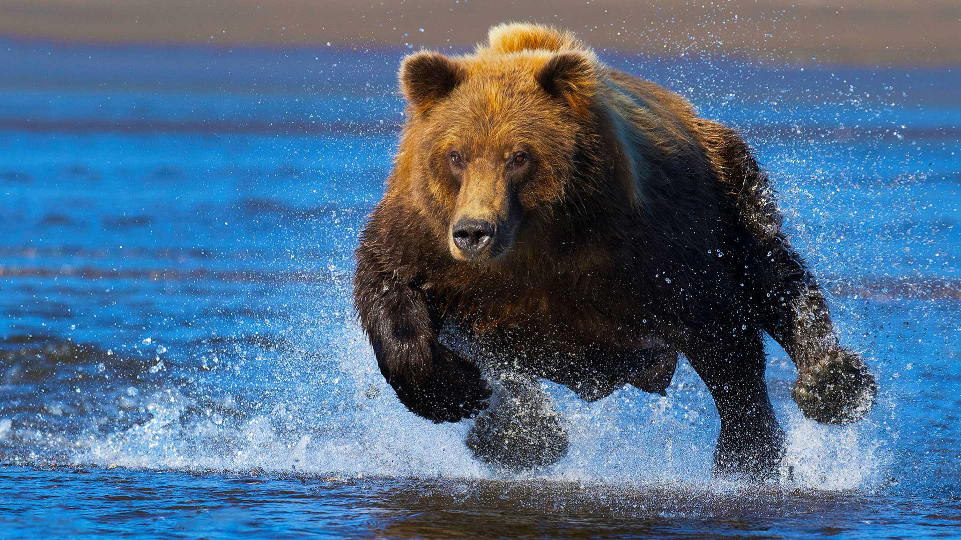 Зрение у гризли, как и у остальных медведей, довольно слабое. Но они отлично ориентируются в пространстве с помощью очень тонкого слуха и обоняния. Гризли – отличный бегун! Он с легкостью развивает скорость до 60 км/ч, и может сравниться в резвости с беговым скакуном. Кроме того, этот могучий хищник прекрасно плавает, охотно купается в жаркое время года, ему не составит труда переплыть вброд небольшую реку.
