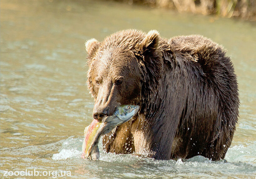 Весной, когда на Аляске огромными стаями лососи плывут к своим нерестилищам, косолапые собираются у речных перекатов и ловят в воздухе выпрыгивающую из воды рыбу. В первую очередь они выедают плавники и кожу, где находится наибольшее количество рыбьего жира.