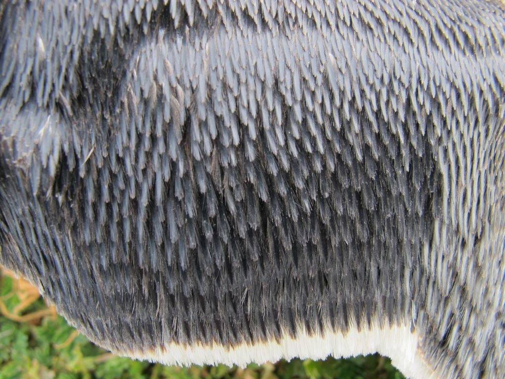 Оперение птиц эффективно отталкивает воду. Они смазывают перья жиром, который выделяется из копчиковой железы. Под верхним слоем перьев находится пух, который не дает животному замерзнуть. Окрас носит камуфлирующую функцию, основные цвета оперения представлены серым, черным и белым оттенком.