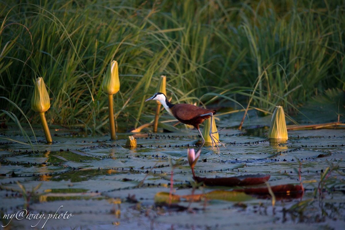 Какой странный бегунец! То бежит на широко растопыренных пальцах, то замирает на воде. Удивительная птичка напомнила мне своим поведением жуков-плавунцов, что скользили в емкости с водой на даче моего дедушки. Это — африканская якана, также известная как птица Иисуса.