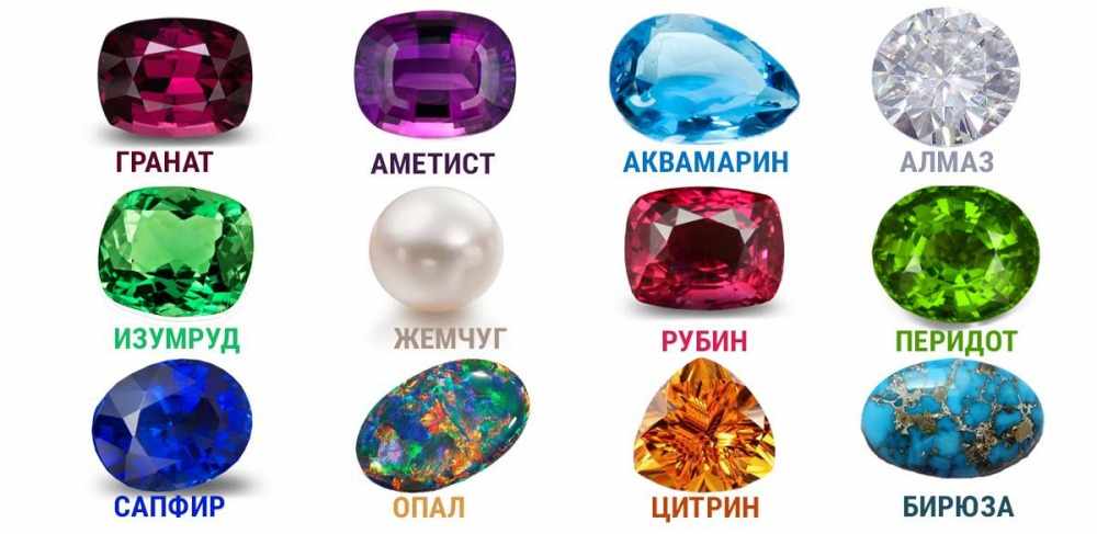 Из металлов это — серебро, золото, платина. Из минералов — алмазы, корунды, бериллы, гранаты, турмалины и их производные, всего чуть более сорока наименований. Любителям украшений больше известны такие обозначения, как рубин, сапфир (корунды), аквамарин, изумруд (бериллы) и так далее.