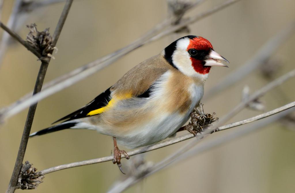 На фотографии ниже перелетная птица с ярким оперением – щегол.