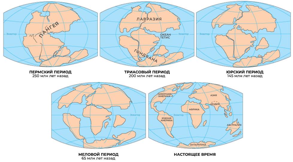 Около 250 млн лет назад на Земле был единственный гигантский континент Пангея (рис. 2). Из-за тектонических движений земной коры под влиянием глубинных процессов в недрах планеты (а также, возможно, из-за врезавшегося в территорию Антарктиды астероида) Пангея через 50 млн лет разделилась на два меньших суперконтинента – Лавразию и Гондвану (см. рис. 2). Лавразия включала Северную Америку, Гренландию, Европу и почти всю Азию. В состав Гондваны входили Южная Америка, Африка, полуостров Индостан, Австралия и Антарктида. Территория последней была покрыта буйной растительностью, на ней обитало множество животных, что подтверждают современные находки костей динозавров, отпечатков листьев на горных породах и пр. (рис. 3–5).