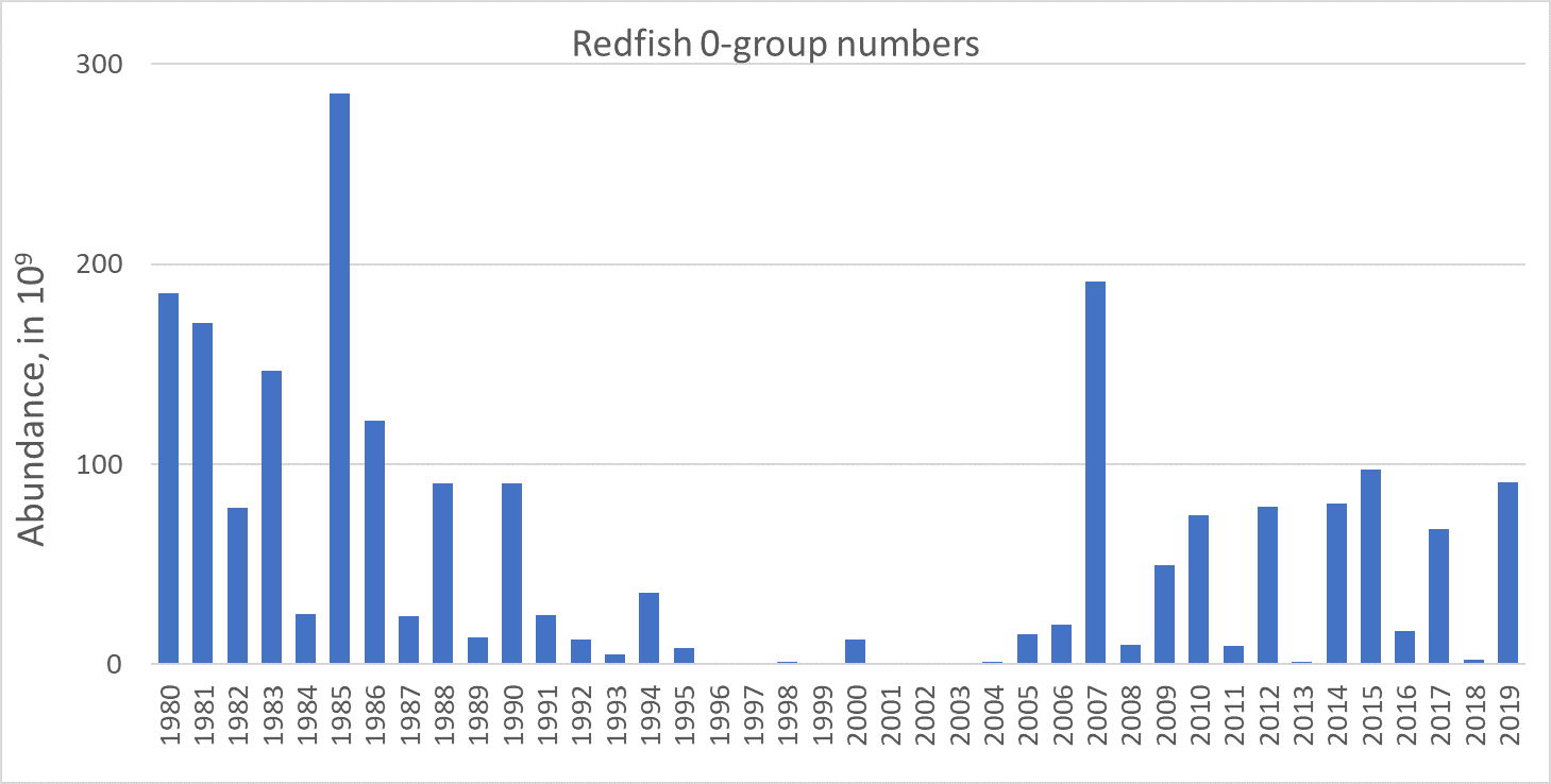 Рис. 3.6.24. Численность нулевой группы окуня-клювача в Баренцевом море в 1980–2019 гг. с поправкой на эффективность трала. Следует заметить, что оценки для 15 новых подрайонов Баренцева моря за период 1980–2018 гг. рассчитывали в MatLab (ICES 2018 WGIBAR), в то время как за 2019 г. — с помощью StoX (Johnsen et al. 2019).