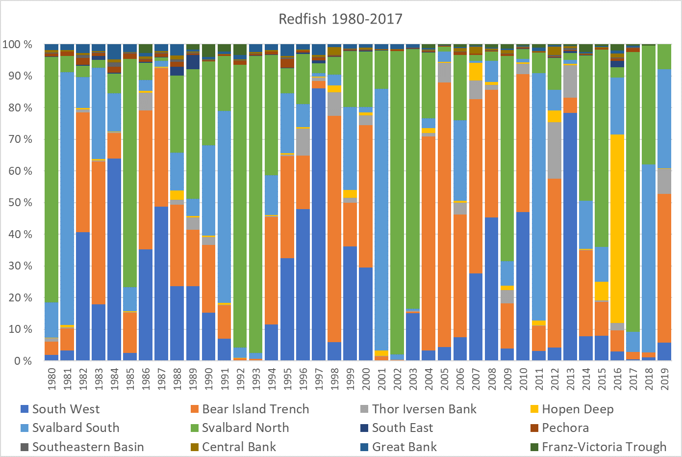 Рис. 3.6.25. Процент численности окуня-клювача нулевой группы в Баренцевом море в 1980–2019 гг. Следует заметить, что оценки для 15 новых подрайонов Баренцева моря за период 1980–2018 гг. рассчитывали в MatLab (ICES 2018 WGIBAR), в то время как за 2019 г. — с помощью StoX (Johnsen et al. 2019).
