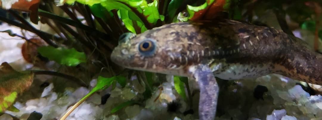 Сильные головастики вылетают из яиц, как ракеты, и стремительно идут к поверхности, чтобы схватить пузырек воздуха. Слабые выбираются из яйцевой оболочки медленно, головой или хвостом вперед, так что спина самки буквально усеяна головами и хвостиками. Эти головастики падают на дно и достигают поверхности, с двух-трех попыток. Захватив пузырек воздуха, они начинают плавать горизонтально. Их почти шаровидное тело имеет диаметр 2,5−3мм, прозрачный хвост — 7−9мм. Головастики группируются в стайку, стремительно удирают от хищников, могут зарываться в ил.